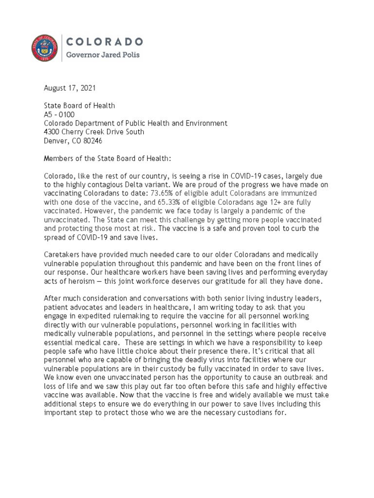 Governor Jared Polis August 17 2021 State Board Of Health Letter Pdf Health Care Caregiver